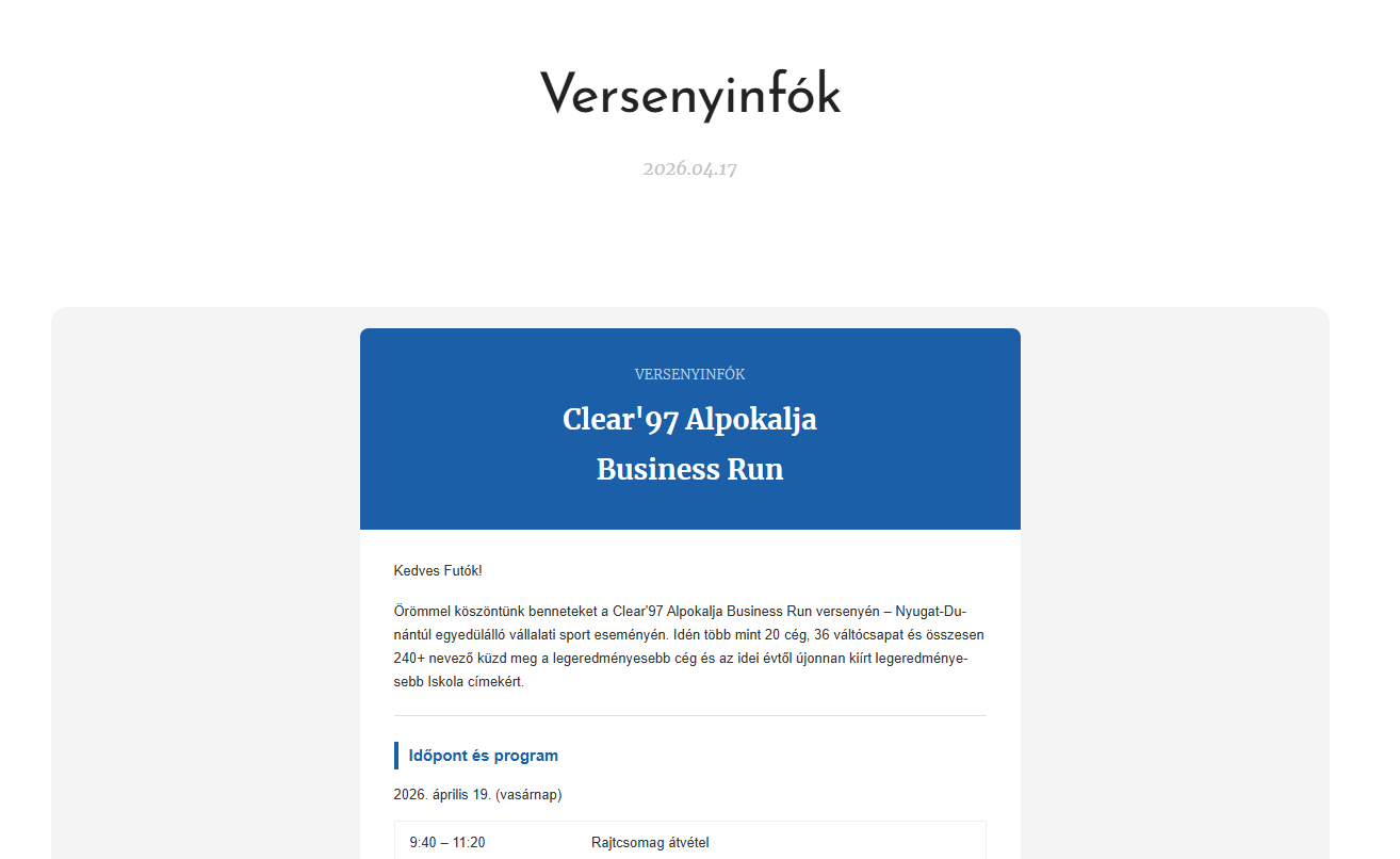 Örömmel köszöntünk benneteket a Clear'97 Alpokalja Business Run versenyén – Nyugat-Dunántúl egyedülálló vállalati sport eseményén. Idén több mint 20 cég, 36 váltócsapat és összesen 240+ nevező küzd meg a legeredményesebb cég és az idei évtől újonnan kiírt legeredményesebb Iskola címekért.